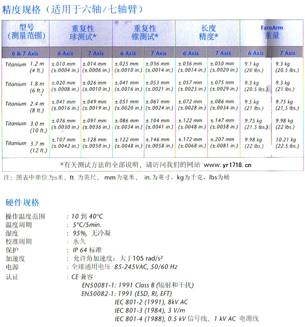 一、MC003-TIARM便攜式鈦金三坐標產(chǎn)品簡介: 靈活,精準,價格合理,最新便攜式CMM 當您想使用Faro Platinum Arm鉑金系列測量臂的便攜式測量和逆向工程性能時,且精度要求較低時--Titanium FaroArm鈦金系列測量臂是您最經(jīng)濟實惠的選擇。 Titanium鈦金系列的高精度―結(jié)合其輕便的結(jié)構(gòu)以提供極好的便攜性―這意味著在工廠車間即可滿足他們的測量需要。Titanium FaroArm測量臂滿足任何人任何地點進行檢測,逆向工程或CAD-to-Part (CAD與實際工件)的分析,高精度工裝等。 本公司歐洲拓展了便攜式測量臂的產(chǎn)品線,推出了新型的Faro Titanium arm鈦金七軸臂,以滿足生產(chǎn)和設(shè)計的精度需要。第七軸的設(shè)計使測量臂Arm更靈活,并可連接使用laser scanner激光掃描頭,其特別的自由度能保證scanner 掃描頭始終處于最合適的位置以提供最有效的掃描,非凡的靈活性和手握式掃描給用戶帶來非接觸式掃描的眾多優(yōu)勢。 Titanium Arm鈦金系列臂的輕質(zhì)量和便攜性可以直接應(yīng)用于生產(chǎn)和加工車間,滿足完成測量任務(wù),結(jié)合功能強大的CAM2軟件使用可對實際工件進行數(shù)模對比,在生產(chǎn)期間進行實時的幾何對比。CAM2 Measure軟件同時也具有獲取工件數(shù)字化資料的逆向工程功能。 多種安裝方式能快速方便地定位測量臂,例如安裝卡盤,磁力吸盤和三角架等,內(nèi)置式電源使Arm測量臂不依靠額外電源即可工作從而更提高了測量臂的便攜性。 二、MC003-TIARM便攜式鈦金三坐標技術(shù)參數(shù):